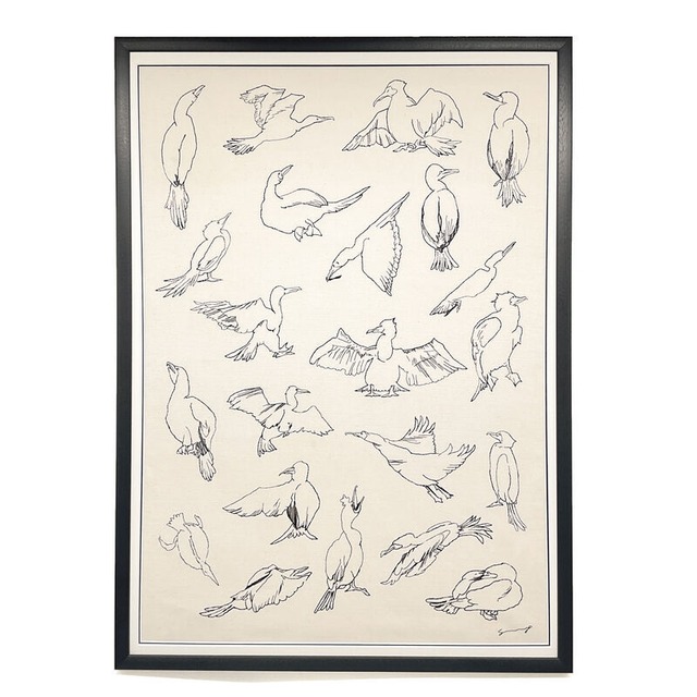 水辺に棲む鵜たち。 羽ばたくもの、休むもの、ただ風を感じているもの。 それぞれの瞬間を、一本の糸でつないでいく。 この刺繍は、鵜という生きものの 「とぼけた強さ」と「人間くささ」を描いた作品です。 白鷺と共に狩りをする彼らは、どこかずる賢い。 けれどその姿は懸命で、美しい。 動きを追うように、リズムを縫い留めるように。 生成りの麻の上に浮かぶ線は、 まるで水面に揺れる光のように、静かに呼吸しています。 日々の暮らしの中に、この一枚を。 白壁のリビングや、光の差し込む窓辺、 書斎やアトリエの静かな空間にもよく似合います。 朝のコーヒーの香りや、夜の灯りとともに、そっと。 *一点もののため、再販はございません。 *作品はすべて、手仕事による一点制作です。 サイズ:68cm × 93cm 額:ウッドフレーム 生地:生成りの麻 刺繍糸使用